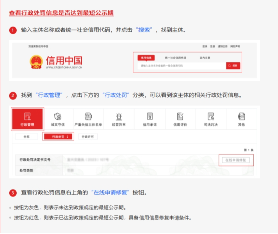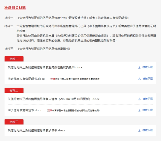 如果您在“信用中國”網(wǎng)站上查詢到您企業(yè)發(fā)生了失信行為,可以按照以上流程進(jìn)行信用修復(fù),信用修復(fù)前請?zhí)崆斑M(jìn)入流程指引網(wǎng)址,點(diǎn)擊第二步下載準(zhǔn)備材料模板。