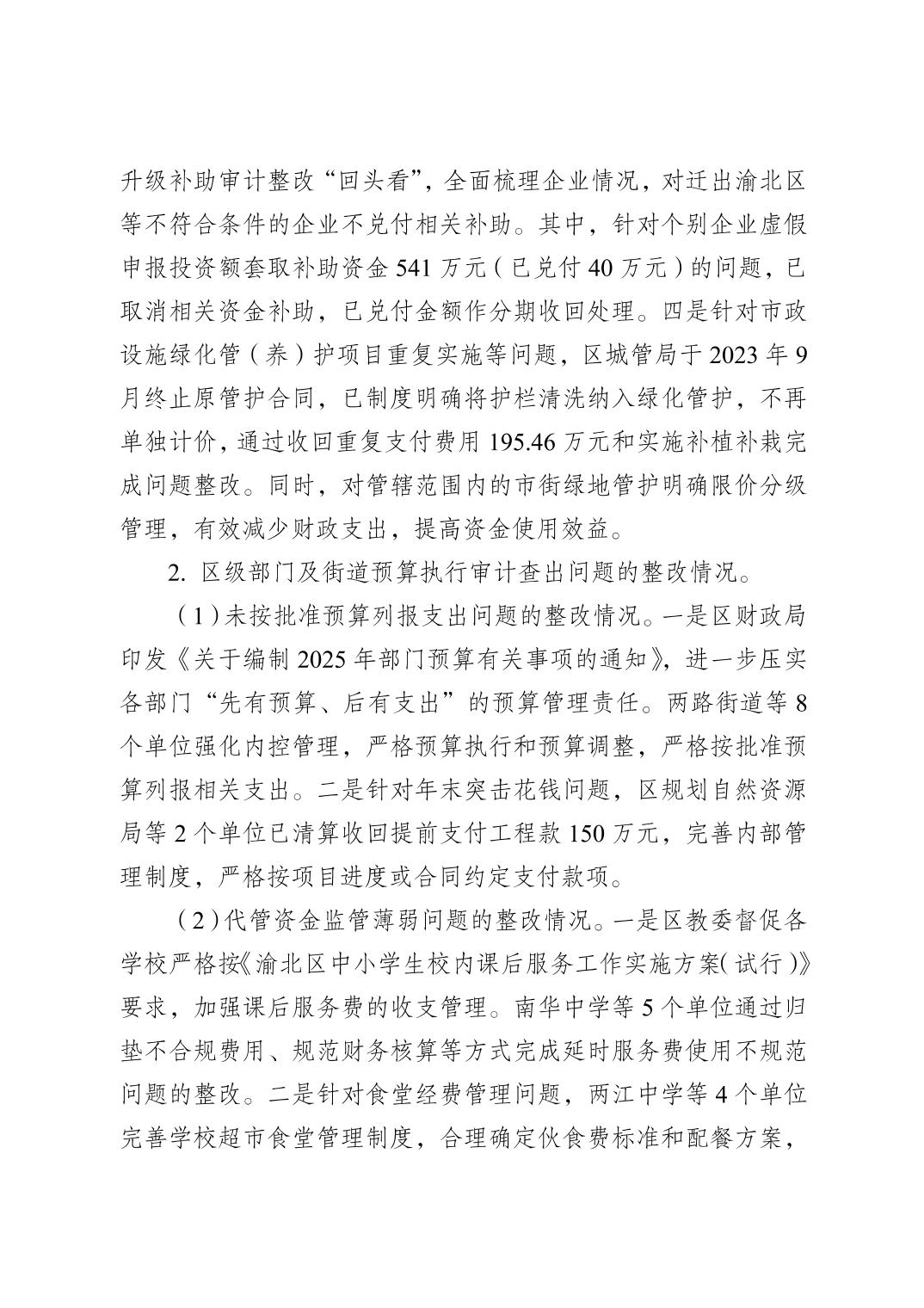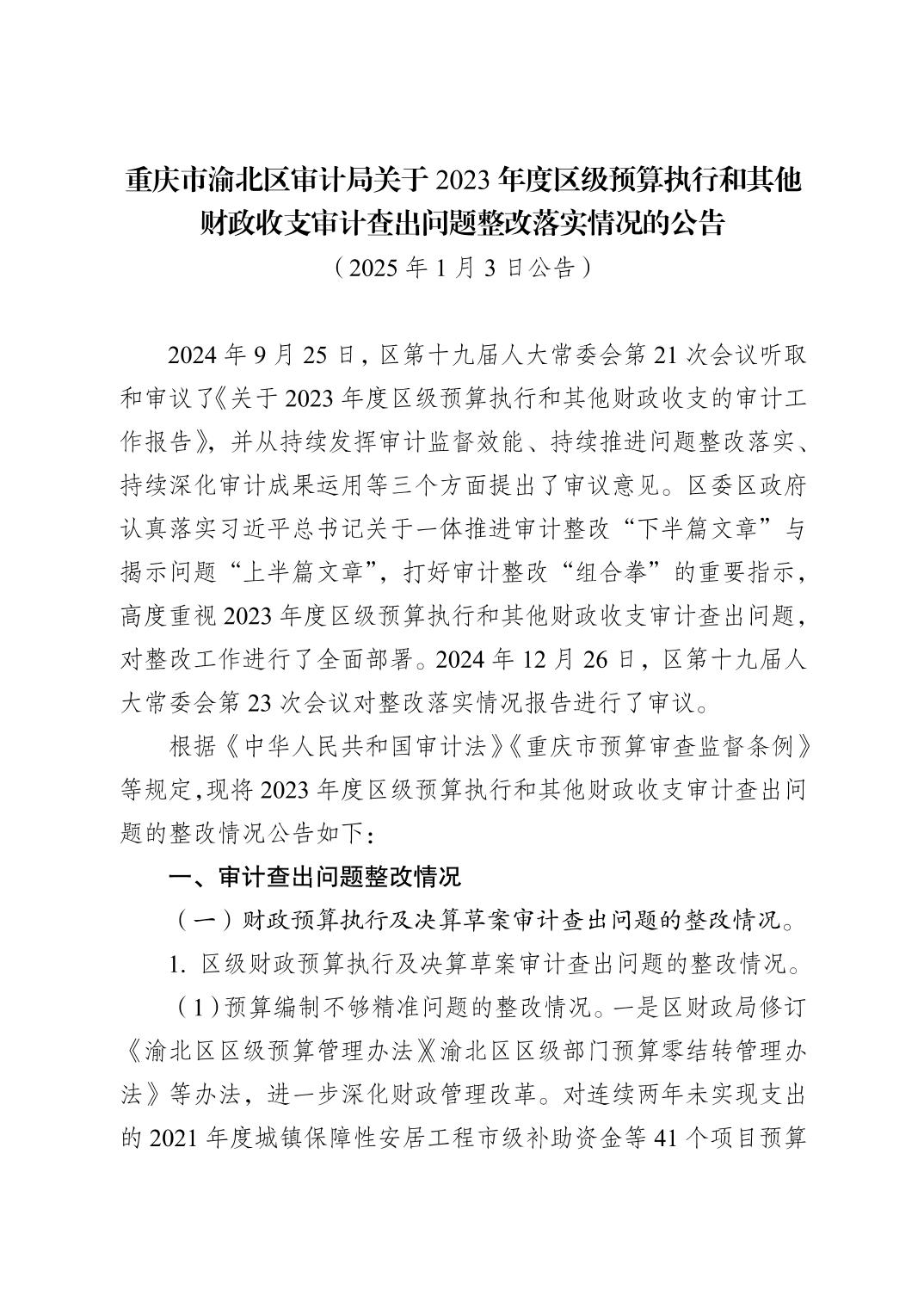 重慶市渝北區審計局關于2023年度區級預算執行和其他財政收支審計查出問題整改落實情況的公告